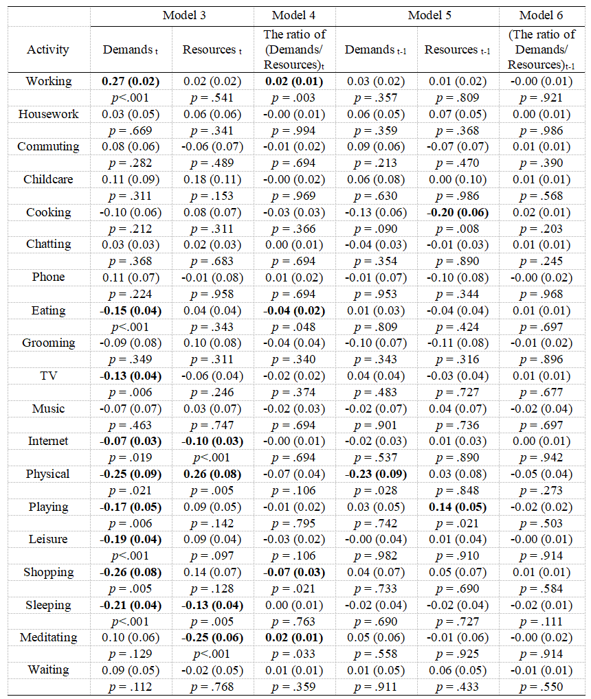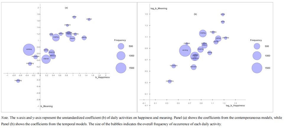 多水平模型分析表明,同时期的感知需求和需求/资源比值与意义提升的活动(如学习和工作)呈正相关,而与同时促进快乐与意义的活动(如进食、购物)呈负相关。需求/资源比值还预测了随后更多的冥想参与,而冥想也能够增进快乐与意义。除此之外,较高的需求水平预测了随后的身体活动减少,而身体活动与提升幸福感和意义感相关。